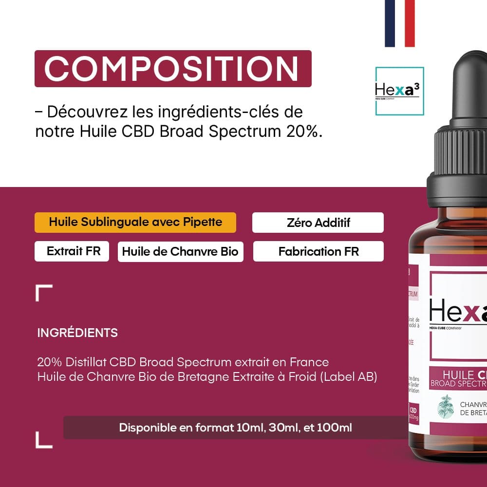 Le flacon d’huile CBD 100ml contient de l’huile de chanvre extraite à froid et issue de l’agriculture biologique, 20 000mg de distillat de CBD Broad Spectrum sans THC extrait en France et issu de plant de Cannabis sativa L inscrite au catalogue EU. La Fabrication est Française.