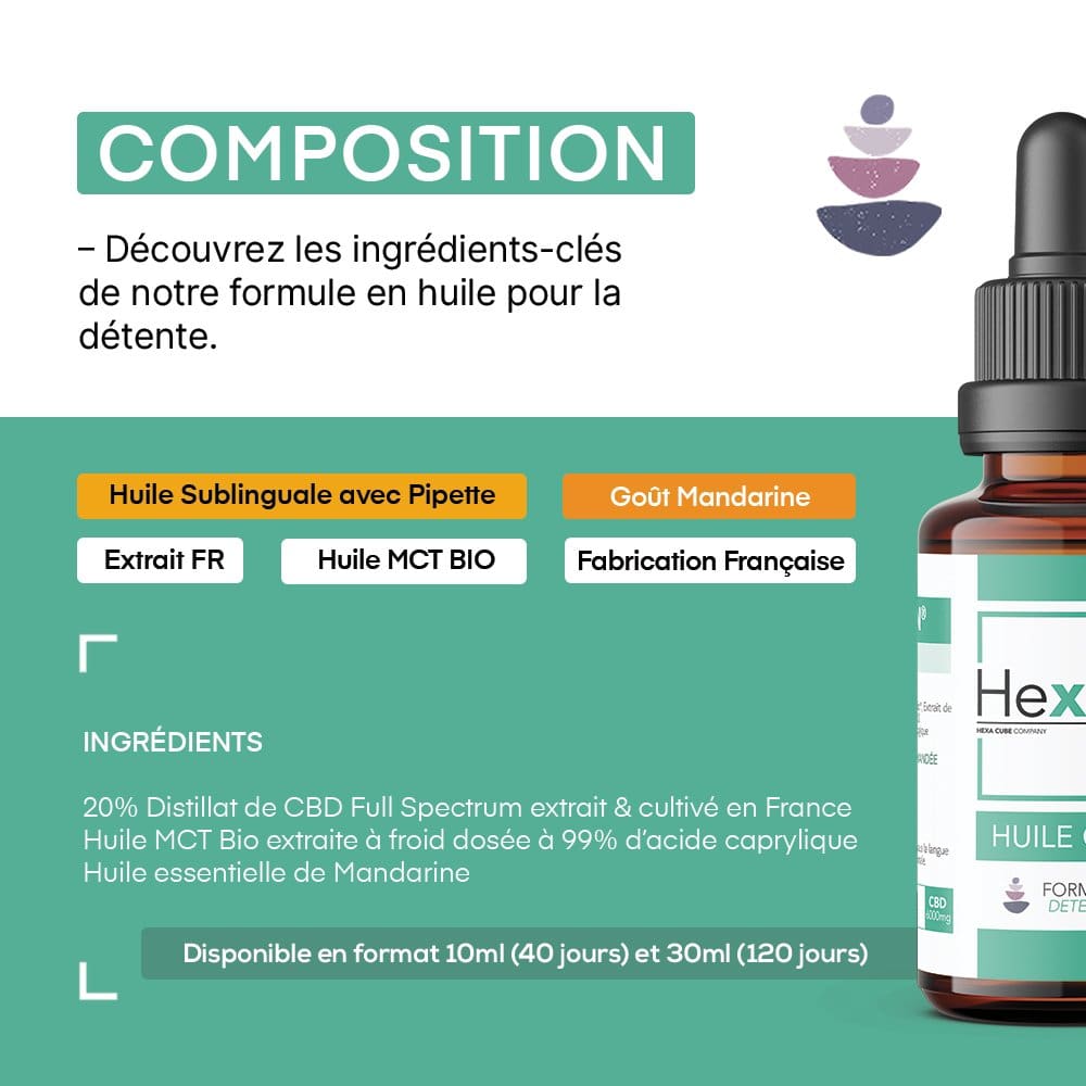 L’Huile CBD Détente HexaZEN® 10ml, c’est une utilisation sur 40 jours, pour vous aider à retrouver du calme et de la sérénité.