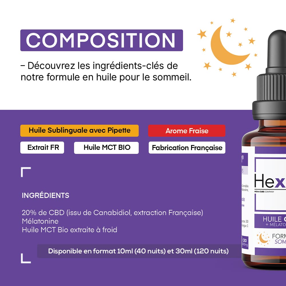 L’huile de CBD Sommeil HexaSOM® contient les ingrédients suivants :