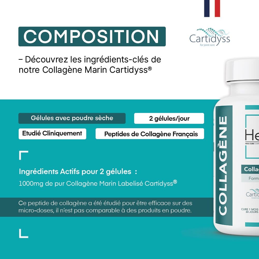 Une boîte de Collagène marin Cartidyss® Hexa3 dure 1 mois. Elle contient 60 gélules de 0.5g de collagène marin français de type 2 .