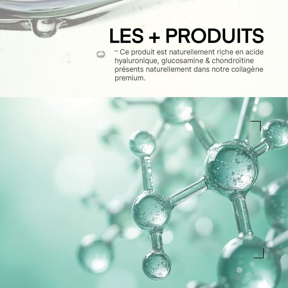 C’est un des seuls collagène qui présente cette teneur naturel en actif tels que la chondroïtine, la glucosamine, ou encore l’acide hyaluronique, avec une bio-disponibilité unique, ce qui en fait un produit extrêmement efficace en termes d’assimilation, sans avoir à prendre 10gr ou 15gr de poudre par jour.