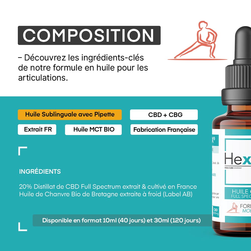 L’huile de CBD Mobilité HexaFLEX® contient les ingrédients suivants :
