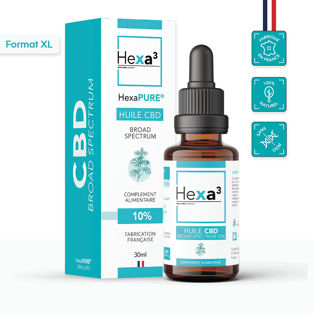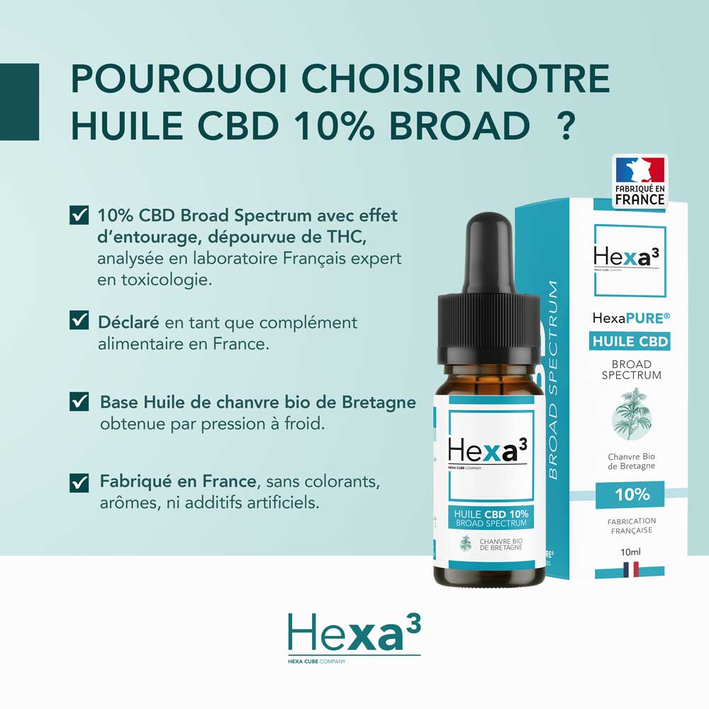 Une huile CBD de qualité prémium et made in France. L’Huile CBD 10% Broad Spectrum HexaPURE® est un produit 100% fabriqué en France dans un laboratoire certifié bio. Sa composition vous permettra de bénéficier des bienfaits du CBD et des autres cannabinoïdes contenu dans les plants de cannabis sativa comme CBN cannabinol, CBG cannabigérol etc.). Le seul cannabinoide exclu de cette composition est le THC, conformément à la législation en vigueur.