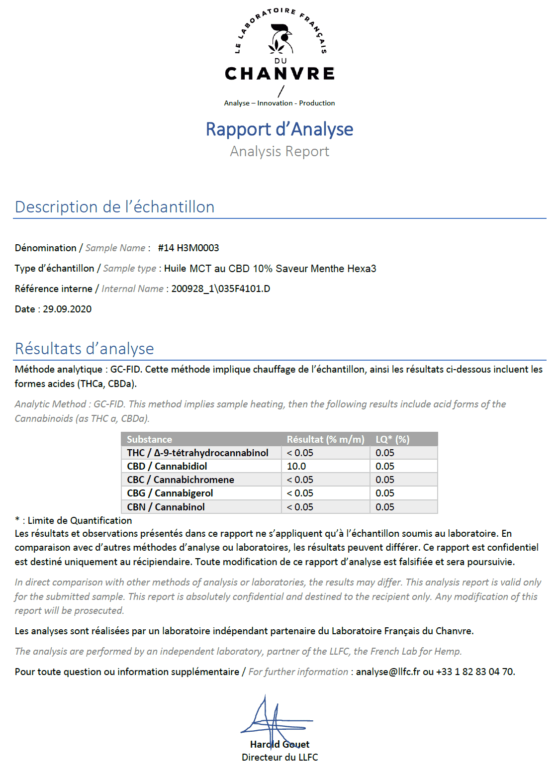 Cette huile CBD 10% Menthe produit est fabriqué au sein de l’Union Européenne selon la norme HACCP (Hazard Analysis and Critical Control Point soit système d’analyse des dangers et point critiques pour leur maîtrise). C’est une méthode de maîtrise de la sécurité sanitaire des denrées alimentaires élaborée aux Etats-unis par un laboratoire dépendant de la NASA dont l’objectif est la prévention, l’élimination ou la réduction à un niveau acceptable de tout danger biologique, physique, chimique et allergène.