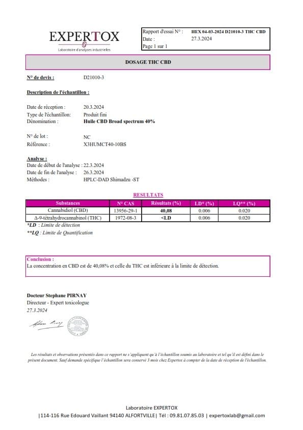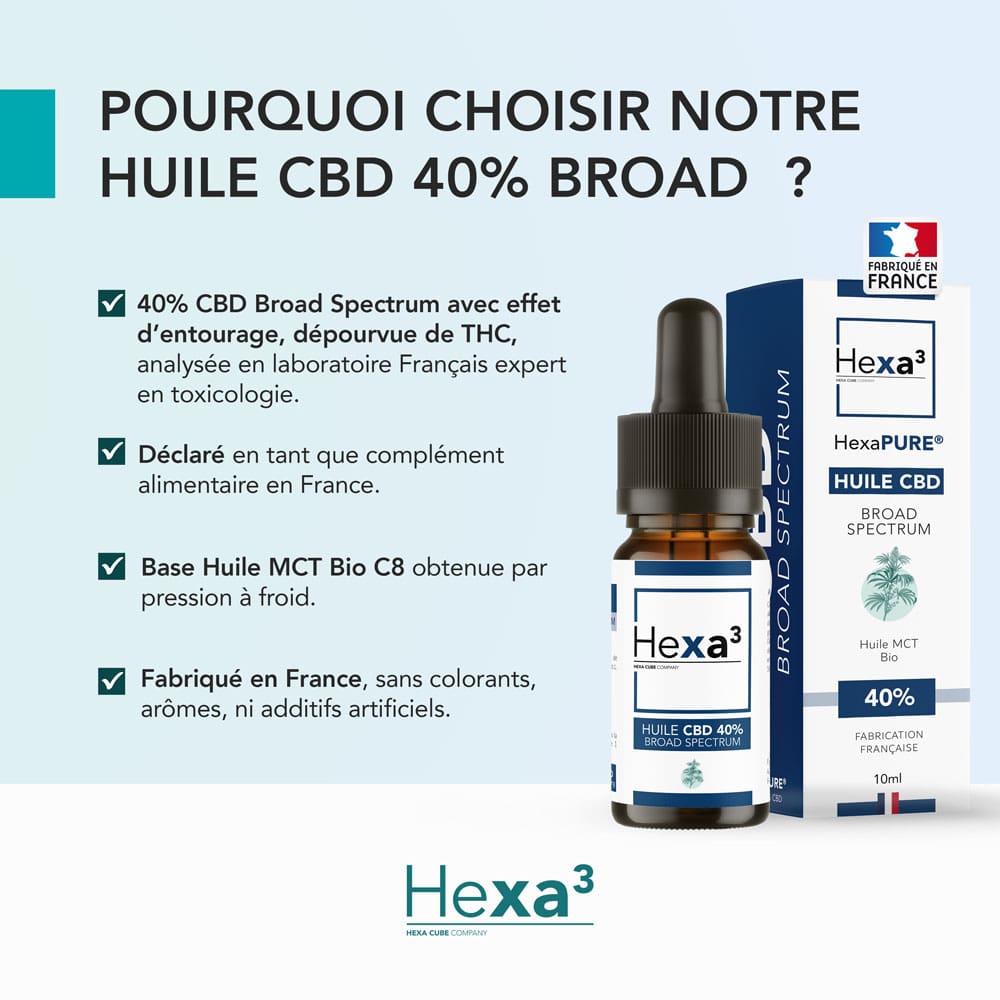 L’Huile CBD 40% Broad Spectrum HexaPURE® est un produit 100% fabriqué en France. Cette huile est riche en cannabinoïdes présents dans le chanvre (CBG, CBC, CBN etc.), mais elle est dépourvue de THC.