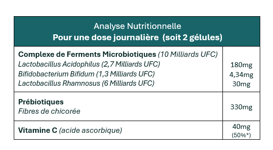 Ingrédients pour 2 gélules (1074 mg) : complexe de ferments : Lactobacillus acidophilus 180 mg (soit 2,7 milliards UFC), Bifidobacterium bifidum 4,34 mg (soit 1,3 milliard UFC), Lactobacillus rhamnosus 30 mg (soit 6 milliards UFC), fibres de Chicorée 330 mg, agent de charge : maltodextrine, gélule d’origine végétale, vitamine C 40 mg (50% VNR), anti-agglomérant : stéarate de magnésium.