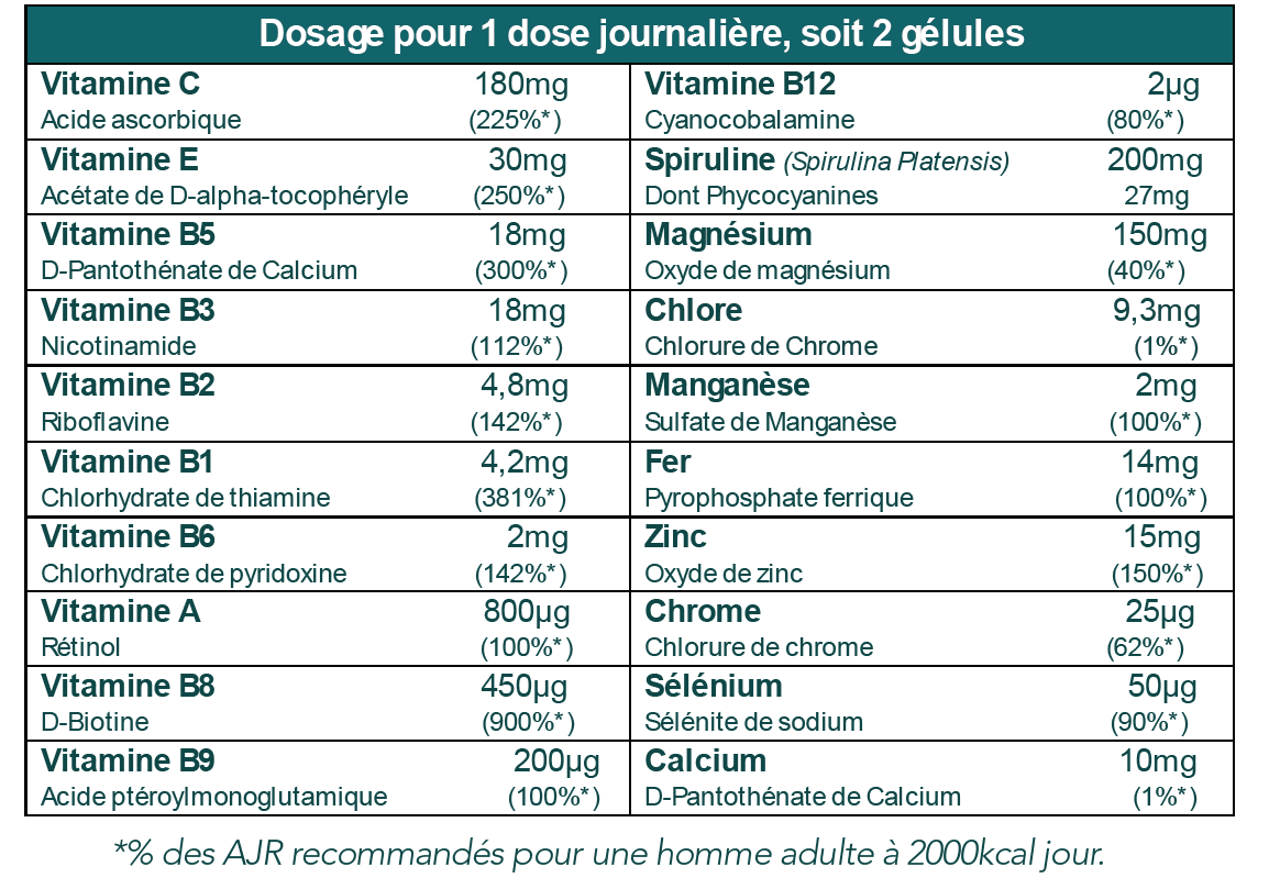 Complexe vitaminique : C (acide ascorbique) 180 mg (225% VNR), E 30 mg (250% VNR), B5 18 mg (300% VNR), B3 18 mg (112% VNR), B2 4,8 mg (342% VNR), B1 4,2 mg (381% VNR), B6 2 mg (142% VNR), A 800 μg (100% VNR), B8 450 μg (900% VNR), B9 200 μg (100% VNR), B12 2 μg (80% VNR) ; oxyde de magnésium (magnésium 150 mg, 40% VNR), spiruline (sulfites) 200 mg (Arthrospira Platensis), gélule d’origine végétale, pyrophosphate de fer (fer 14 mg, 100% VNR), anti-agglomérant : stéarate de magnésium, oxyde de zinc (zinc 15 mg, 150% VNR), sulfate de manganèse (manganèse 2 mg, 100% VNR), chlorure de chrome III (chrome 25 μg, 62% VNR), sélénite de sodium (sélénium 50 μg, 90% VNR).